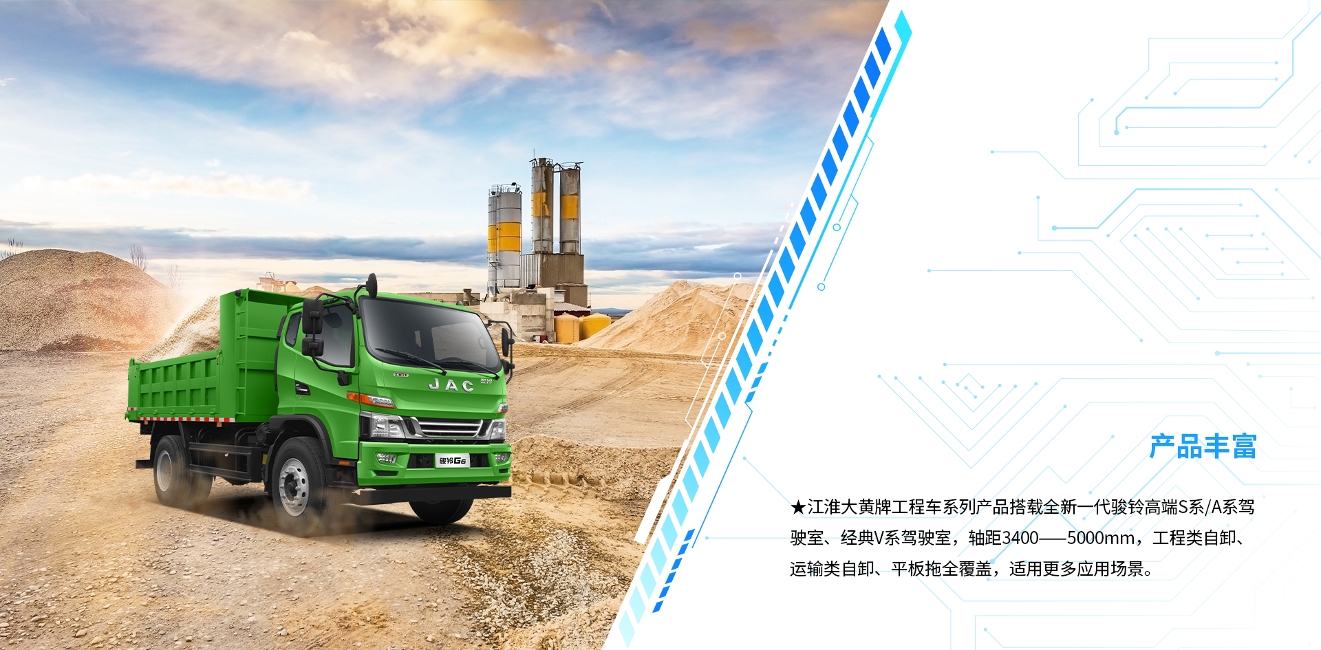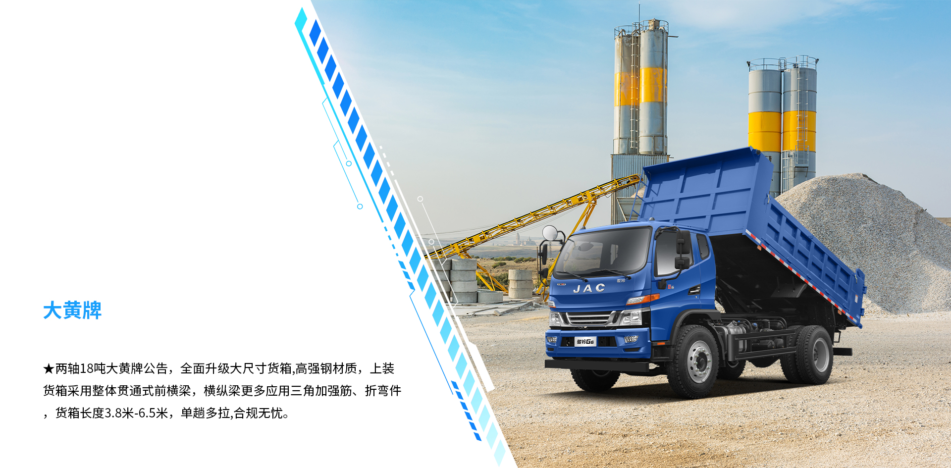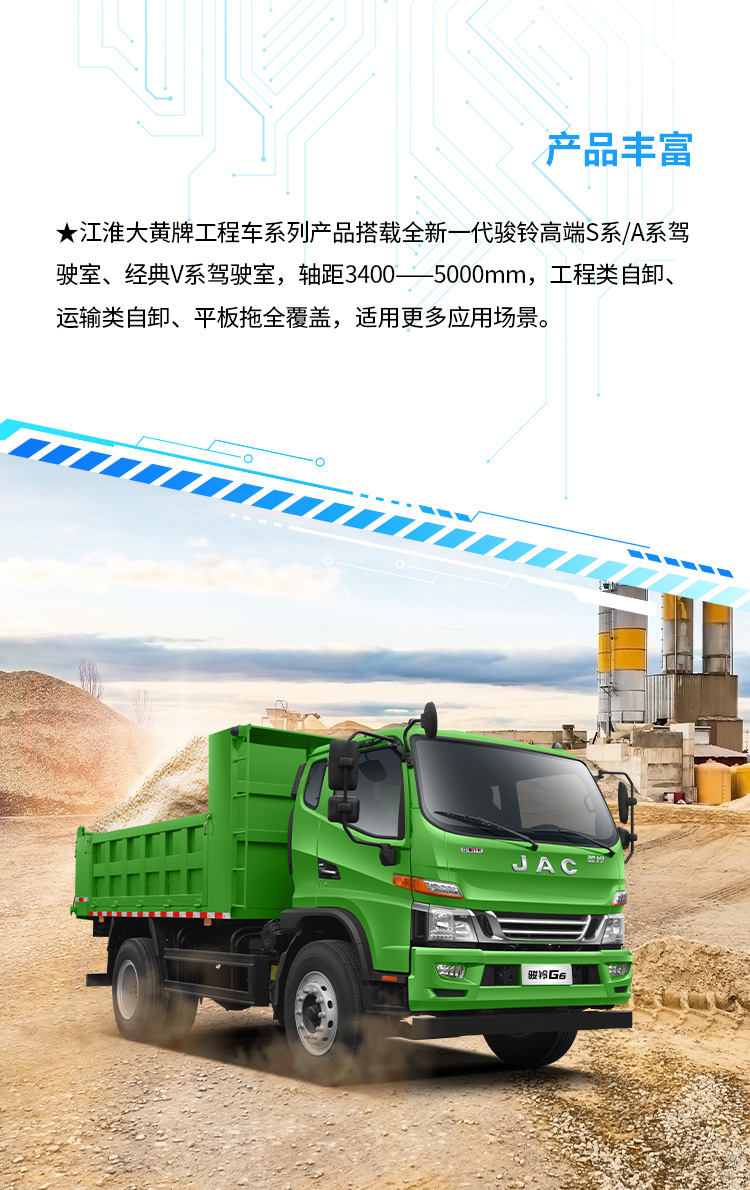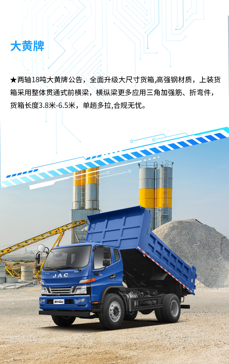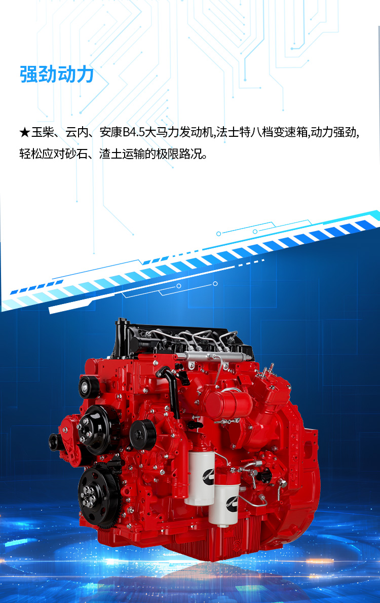 | 配置信息 | 基本配置 | 普通漆,ABS,动转,气压鼓式,断气刹,排辅,变速箱8JS85TE-C带同步器 ,日间行车灯、MP3收音机,普通方向盘,电喇叭、气喇叭、多片簧,工程类3800*2100*800货箱,5.286速比后桥 ,防飞溅装置 ,排放监控终端+车联网+北斗,USB接口 | 动转、行车记录仪、排辅、断气刹、离合助力、ABS、普通轮辋、MP3、车辆网,日间行车灯、沙漠空滤、改大宽尾、增加平衡梁、气控、增加缓降功能 | 动转、排辅、断气刹、离合助力、ABS,备胎,车联网,日间行车灯、加宽后视镜 | 动转、行车记录仪、排辅、断气刹、离合助力、ABS、普通轮辋、MP3、车联网、日间行车灯、加宽后视镜 | 普通漆、ABS、动转、气压鼓式、断气刹、排辅、8JS85TE-C变速箱带同步器 、行车记录仪、日间行车灯、MP3收音机、多功能方向盘、不带备胎、多片簧、工程类4150*2200*800货箱、10.00R20 18PR轮胎(纵向花纹)、普通座椅、顶杂物盒、 4.875(10吨后桥) 、电动门窗、中控锁、电加热后视镜、灭火器、防飞溅装置、200L铝合金油箱 | 普通漆、气压鼓式、动转、离合助力、电预热、电熄火、手动门窗、排辅、中控锁、方向盘(娱乐)、顶杂物盒、卧铺、MP3、断气刹、ABS、车联网、防飞溅、200L铝合金油箱、举升蜂鸣器、右转弯报警器、普通座椅、行车记录仪、气控、增加缓降功能 | 动转、行车记录仪、排辅、断气刹、离合助力、ABS、普通轮辋、MP3、车联网、货箱翻转标配大宽尾 |