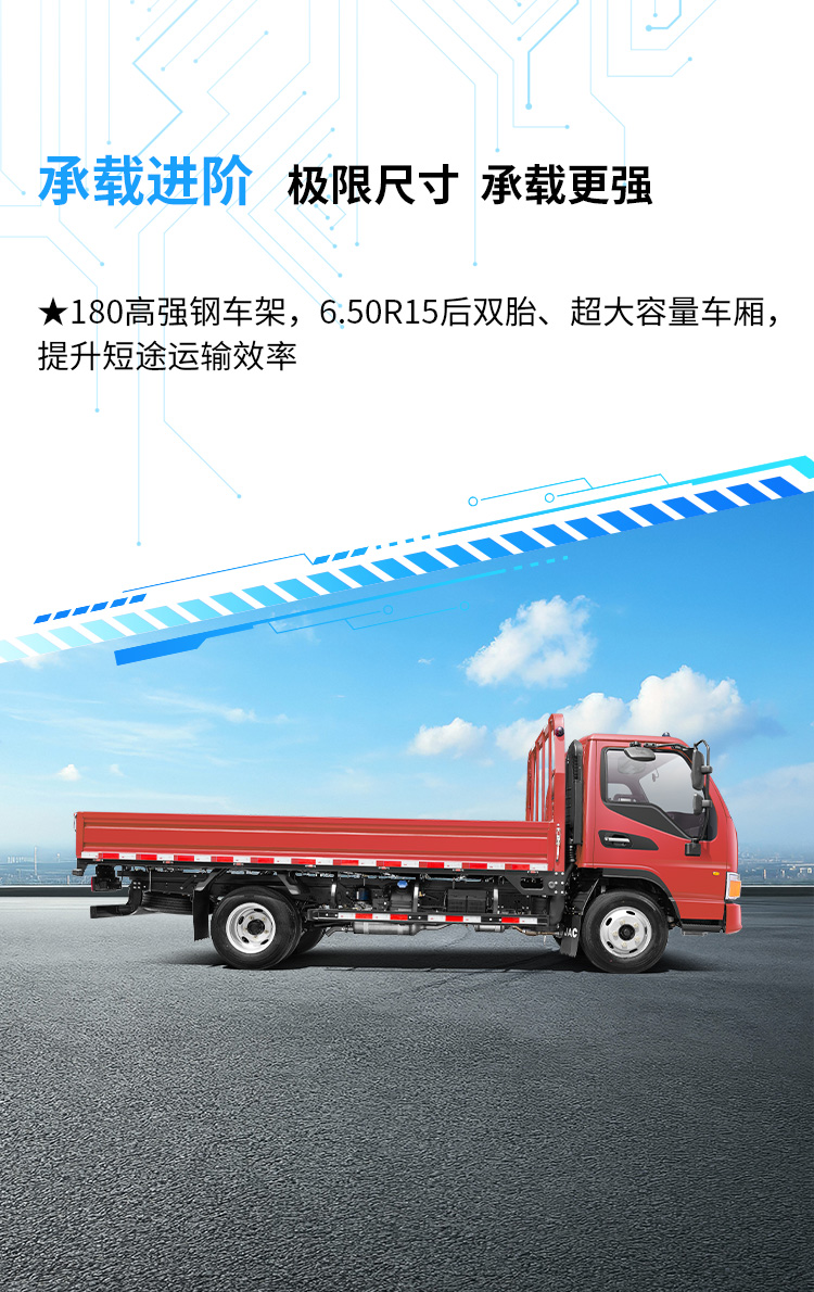 | 配置信息 | 基本配置 | 180*65*4.5,开间750,金属漆,可翻,空调,动转,气压鼓式,断气刹,电动门窗,中控锁,方向盘(娱乐及巡航按键模块),MP3,铁储气筒,铁防护,85L铁油箱,单电瓶,车联网,织布座椅,备胎 | 180*65*4.5,开间750,普通方向盘、翻转、暖风、MP3、双电瓶、动转、ABS、日间行车灯,带前雾灯、车联网、金属漆、全包内饰、无骨雨刷 | 多功能方向盘、翻转、暖风、电预热、MP3、工字梁前桥、动转、ABS、车联网、金属漆 | 180*65*4.5,开间800,普通方向盘、翻转、暖风、MP3、双电瓶、动转、ABS、日间行车灯,带前雾灯、车联网、金属漆、全包内饰、无骨雨刷 | 180*65*4.5,开间750,普通方向盘、翻转、暖风、MP3、双电瓶、动转、ABS、日间行车灯,带前雾灯、车联网、金属漆、全包内饰、无骨雨刷 | 180*65*4.5,开间800,普通方向盘、翻转、暖风、MP3、双电瓶、动转、ABS、日间行车灯,带前雾灯、车联网、金属漆、全包内饰、无骨雨刷 | 180*65*4.5,开间800,普通方向盘、翻转、暖风、MP3、双电瓶、动转、ABS、日间行车灯,带前雾灯、车联网、金属漆、全包内饰、无骨雨刷 | 180*65*4.5,开间800,普通方向盘、翻转、暖风、MP3、双电瓶、动转、ABS、日间行车灯,带前雾灯、车联网、金属漆、全包内饰、无骨雨刷 | 180*65*4.5,开间800,空调,多功能方向盘+电动门窗中控锁,MP3,双80Ah电瓶(带电源总开关),日间行车灯,带前雾灯,全包内饰,取气阀 | ||||||||